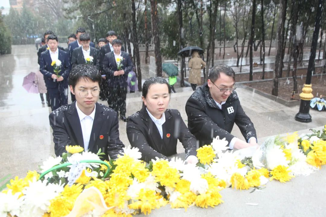 4月2日,双欣矿业联合黄陶勒盖煤炭公司开展“缅怀革命先烈 传承红色基因”清明节祭扫活动。当天,受冷空气影响,即便是大风裹挟着雪花纷纷落下,也阻挡不住大家对革命先烈的敬仰之情,27名团员青年在东胜区烈士陵园的革命烈士纪念塔下整队站列,共同缅怀为民族解放、国家独立、人民幸福而英勇牺牲的革命烈士,并敬献鲜花。祭扫结束后,大家怀着崇敬的心情瞻仰了烈士谱碑亭,在庄严肃穆的广场上,通过讲述个人活动感悟,朗诵爱国诗歌,重温入团誓词等方式,追思先烈、致敬英雄。(柴彪 马亮亮)