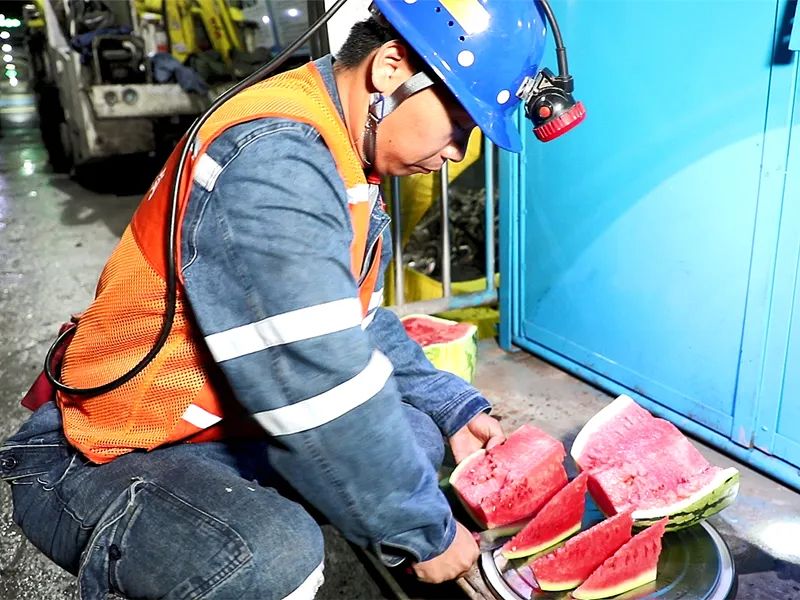 地面防暑工作多形式的有序开展,井下的工作也毫不逊色。7月14日下午3点,在1502工作面电站,青年志愿者宗化方把刚切好的西瓜送到正在检修防爆开关的维修工付波手中。