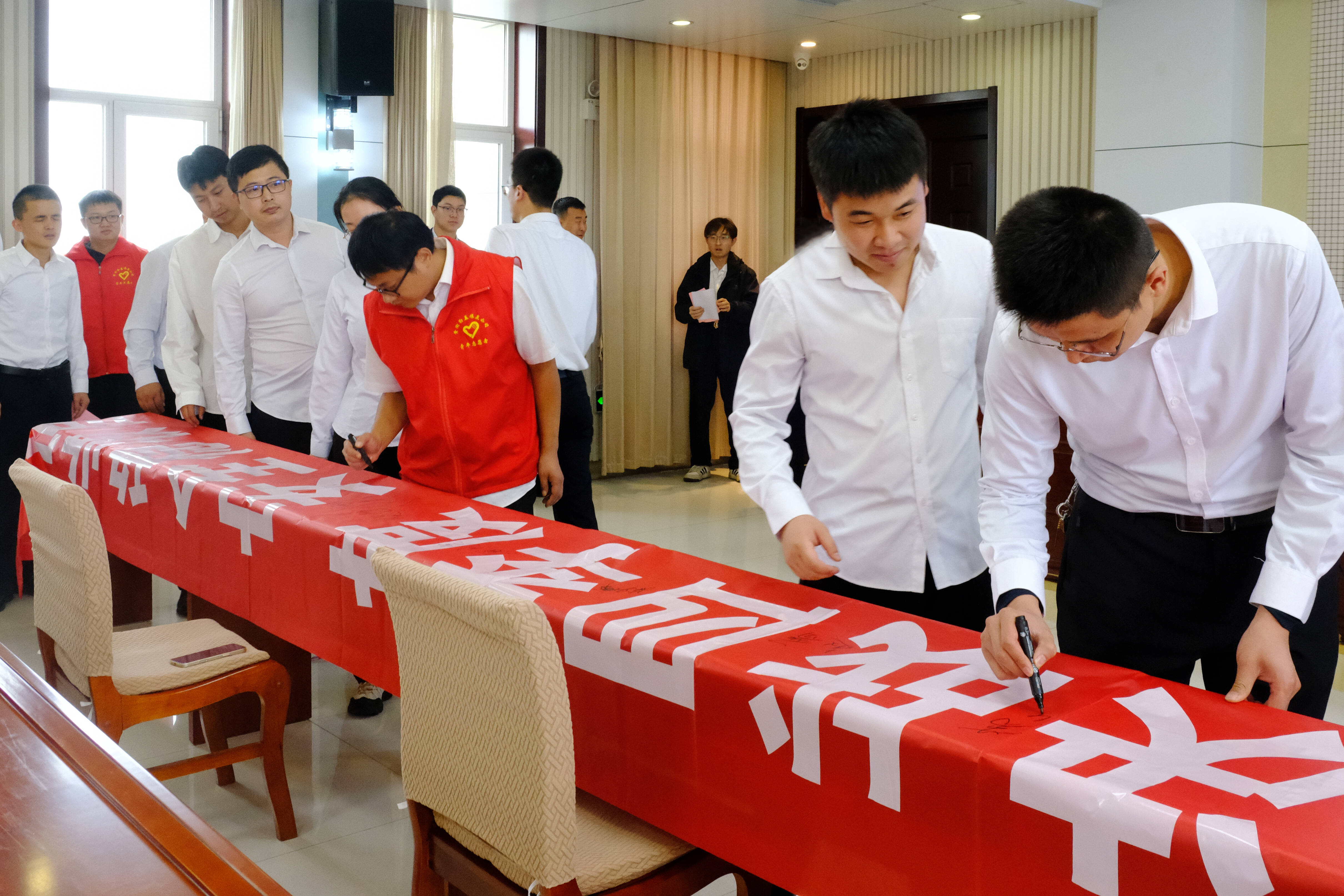 图为黄陶勒盖煤炭公司青年职工在安全主题横幅上签名承诺