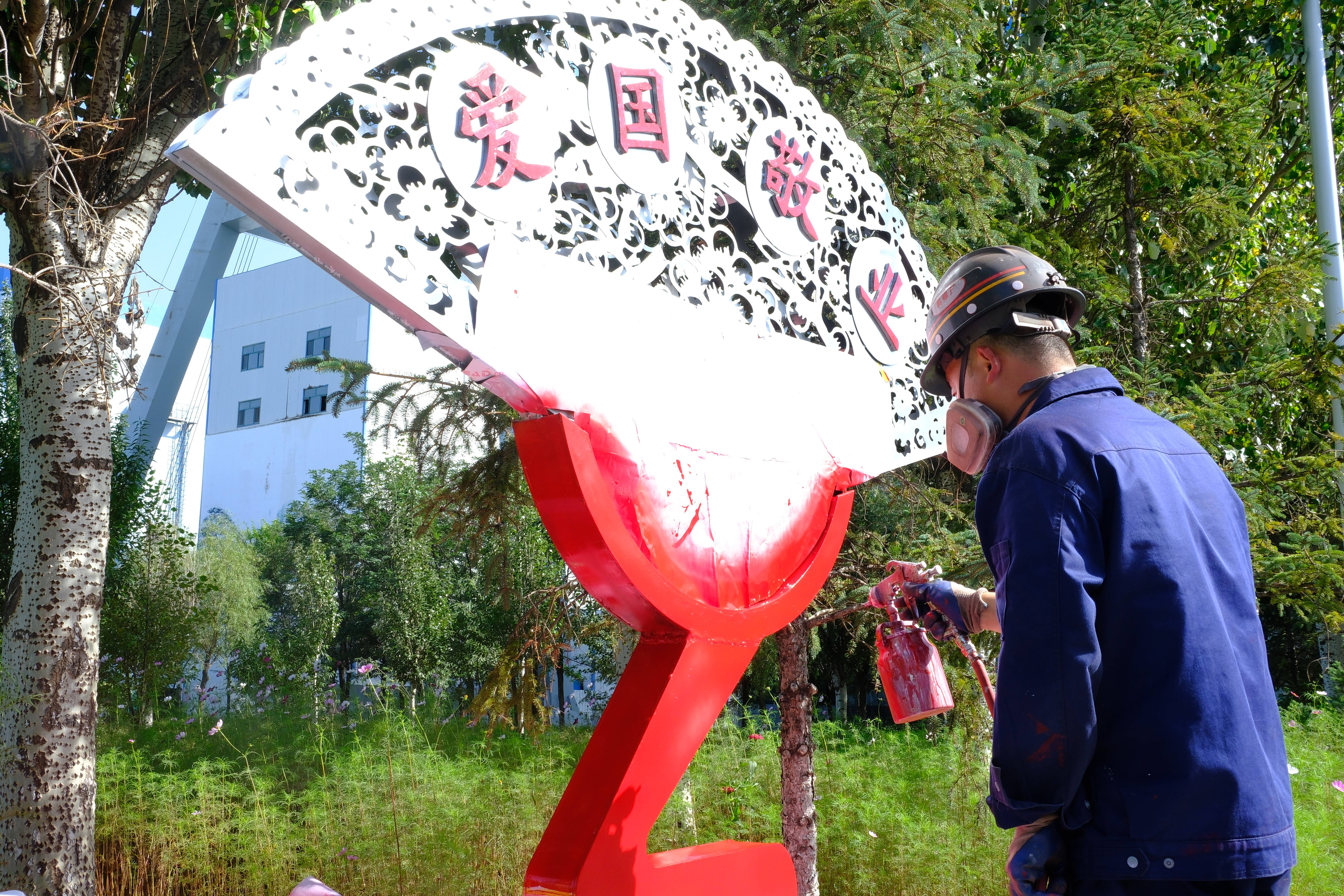 图为黄陶勒盖煤炭公司机修厂职工正在为矿区标识喷漆上色