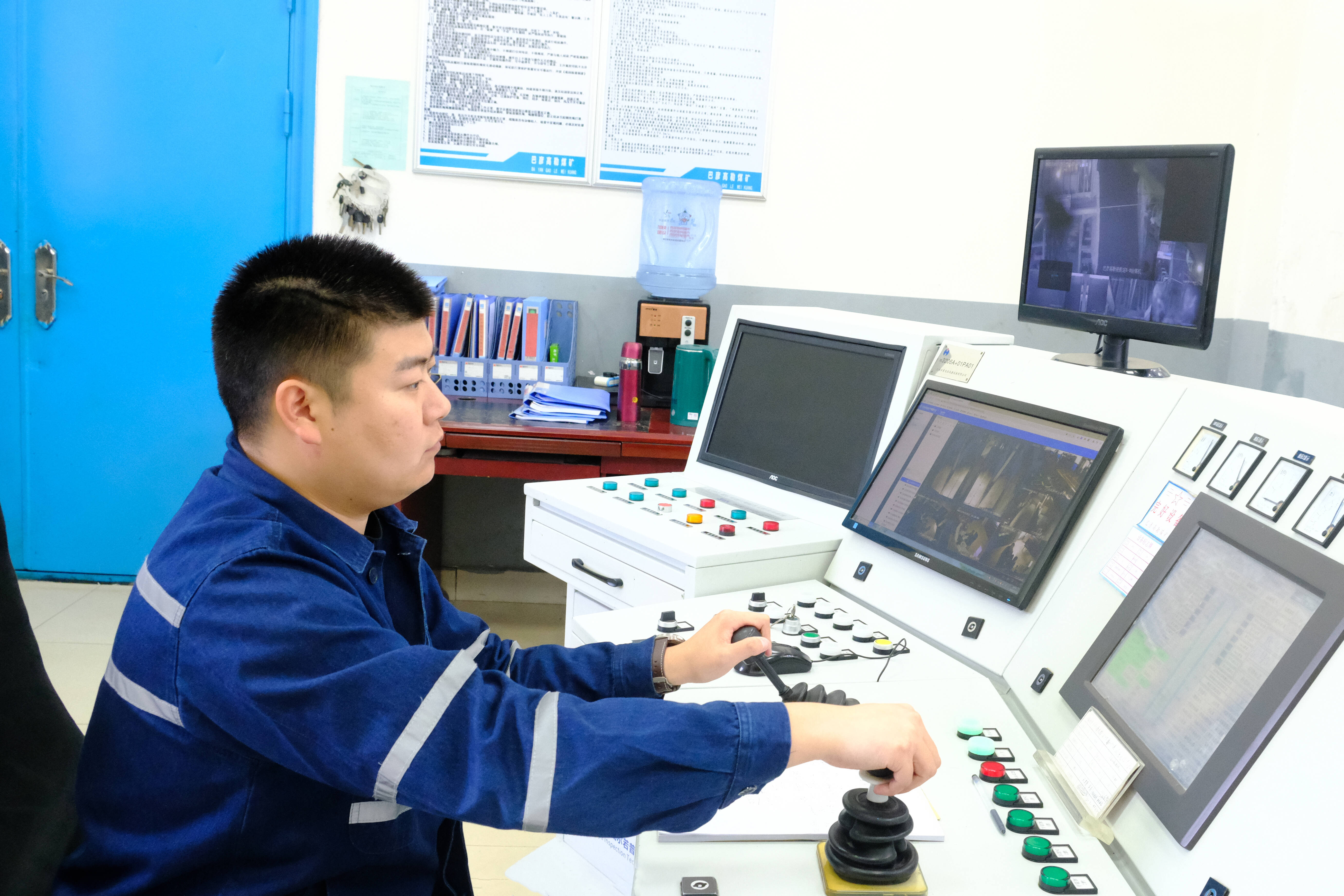 图为黄陶勒盖煤炭公司主井提升机司机监测设备运行情况