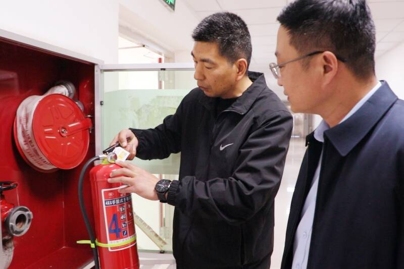 10月16日,该公司消防安全管理员高飞来到联合体,对消防柜里的灭火器逐一进行排查,对查出的问题进行登记并立即整改。