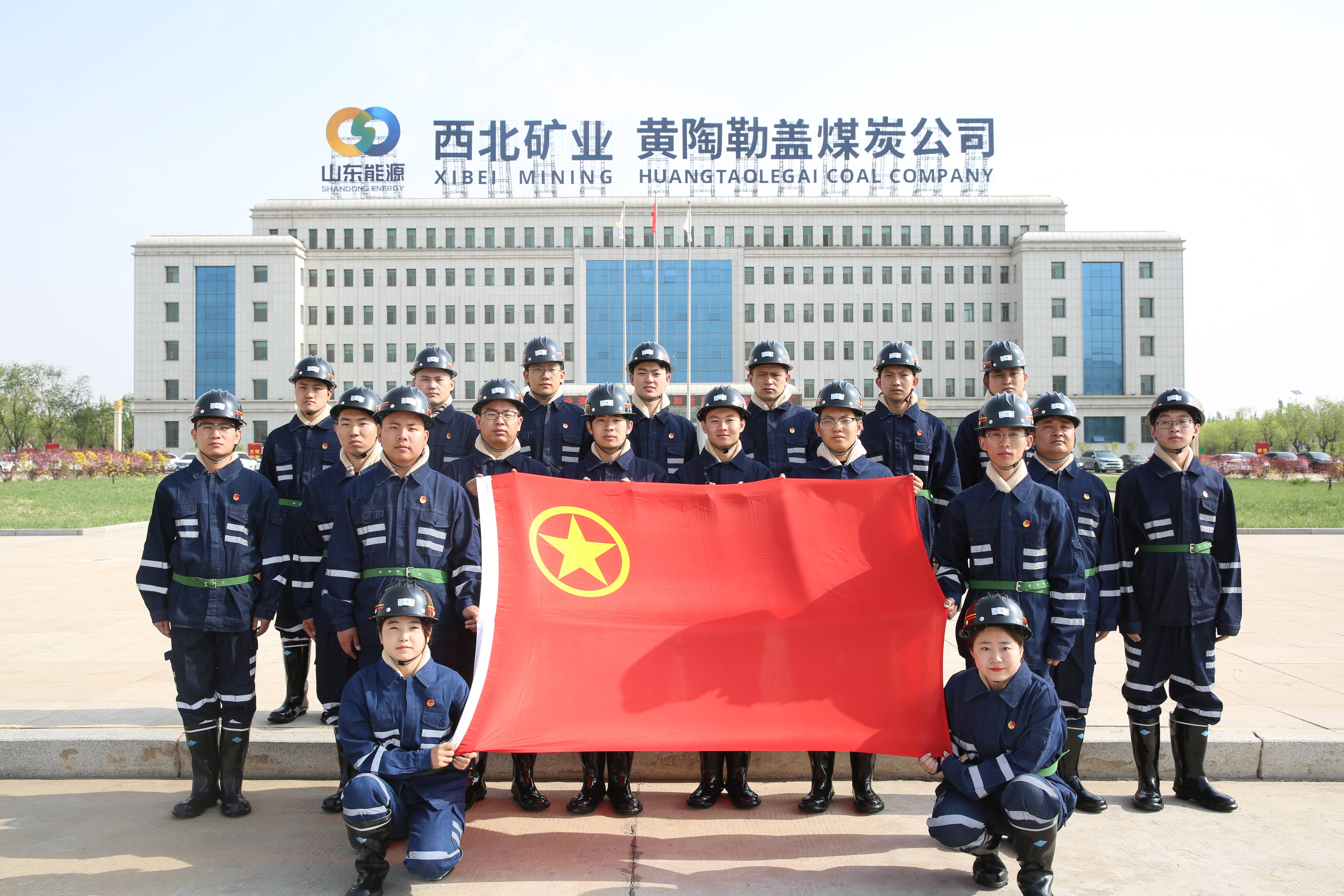 (黄陶勒盖煤炭公司优秀高校毕业生与团旗合影)