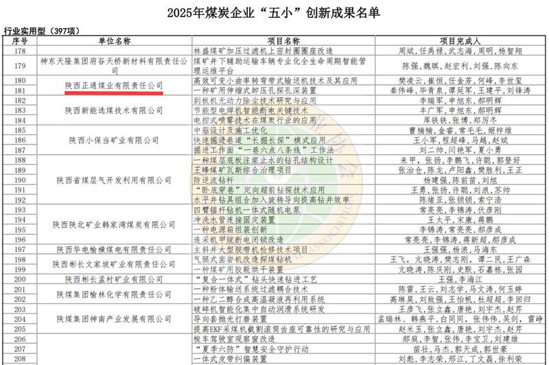 近日,从中国煤炭工业协会获悉,正通煤业申报的《高效可变小曲率转弯带式输送机技术及应用》《一种矿用伸缩式卸压孔探孔深装置》两项创新成果,荣获中国煤炭工业协会2025年煤炭企业“五小”创新成果。正通煤业也因此成为西北矿业唯一获奖单位。