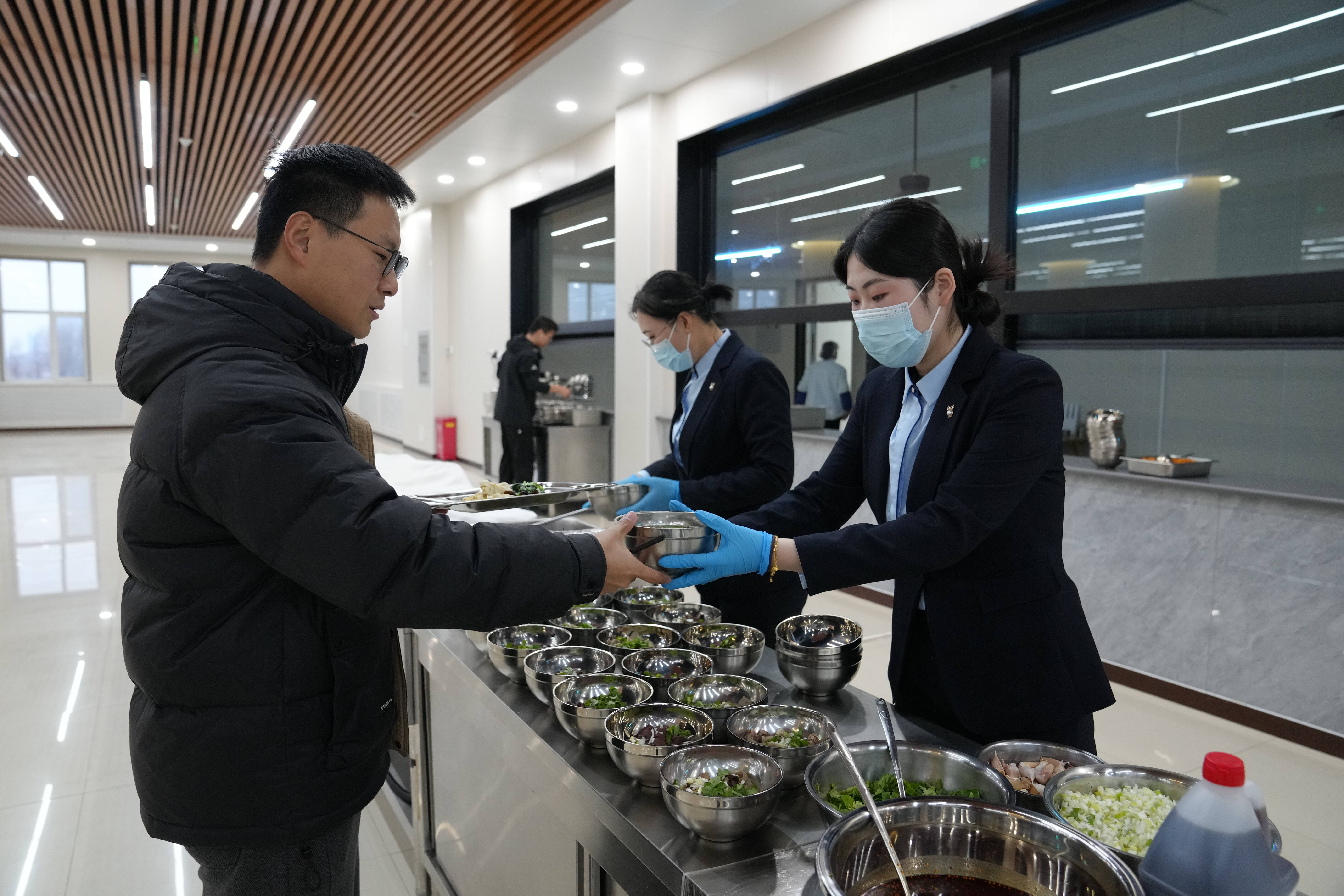 图为油房壕煤矿职工餐厅工作人员为就餐职工送上免费的羊杂汤