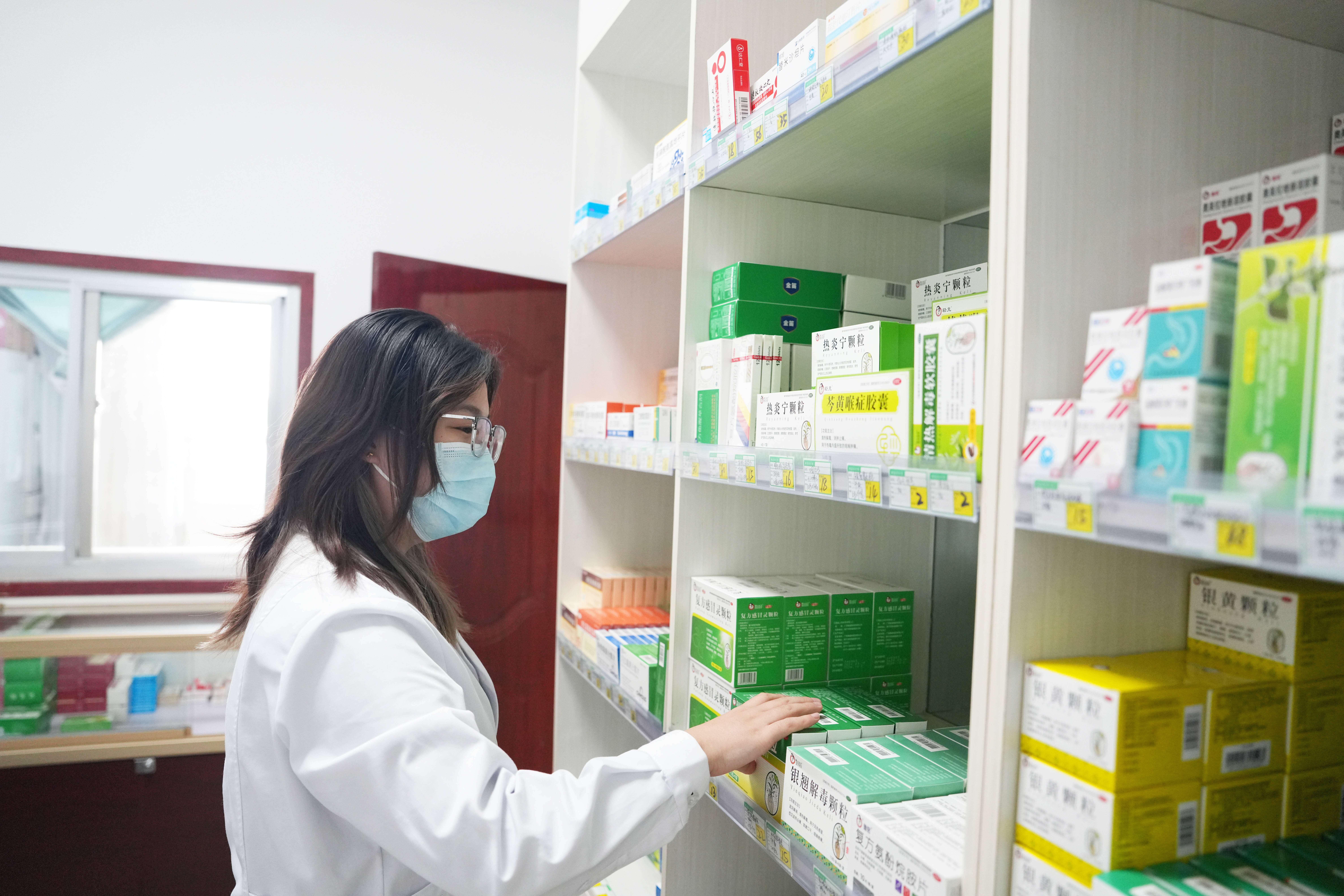 图为黄陶勒盖煤炭公司医务室内医生整理药物