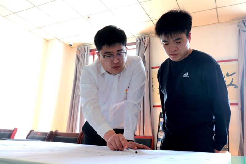 图为正通煤业生产技术部对照图纸正研究井下现场情况