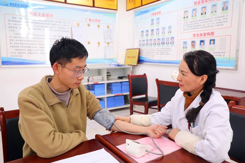 图为邵寨煤业公司医护人员为职工测量血压