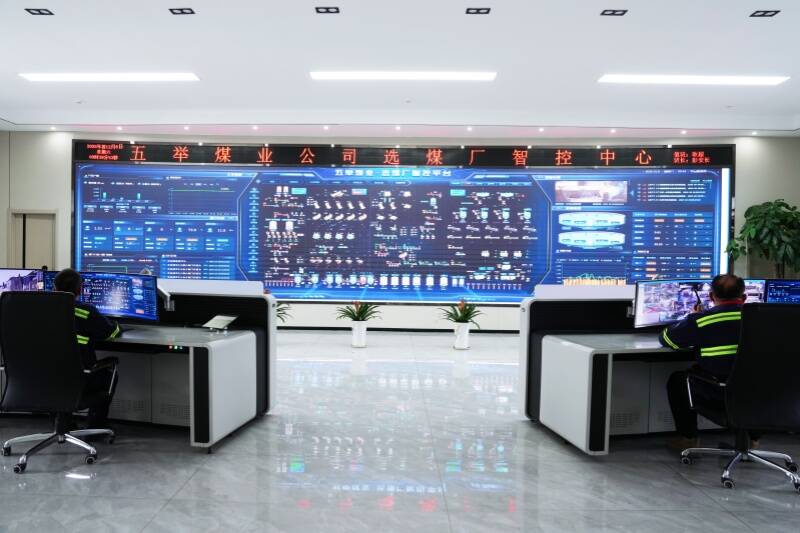 图为五举煤业选煤厂智控中心人员实时查看洗选数据