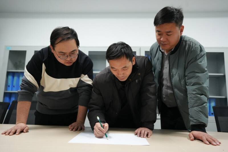 图为五举煤业机电部技术人员正在绘制挡风板草图