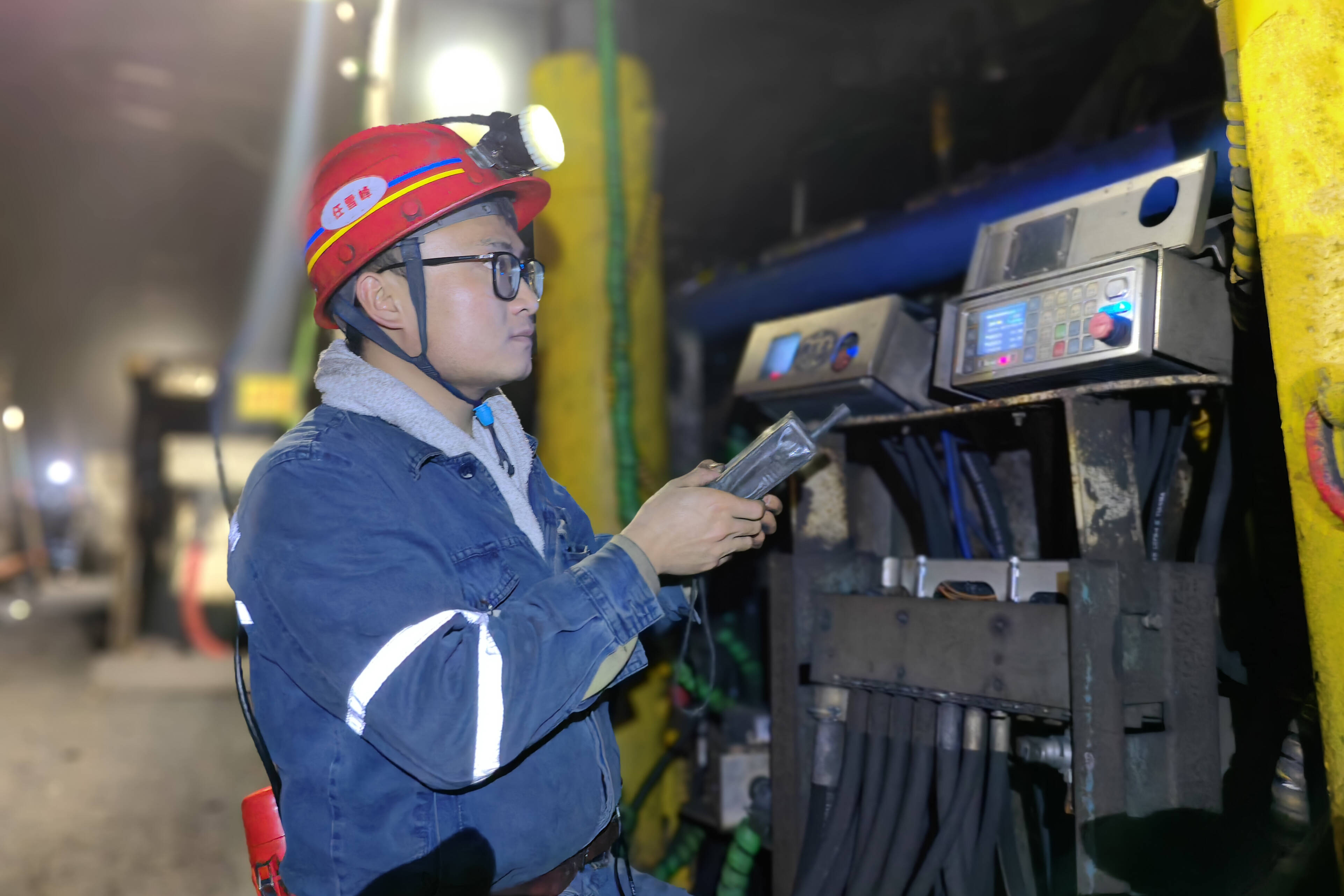 图为黄陶勒盖煤炭公司综采一区党支部副书记任雪峰检查设备运行状态