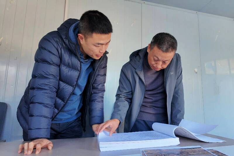 图为夏自翔(右1)现场查看施工图纸