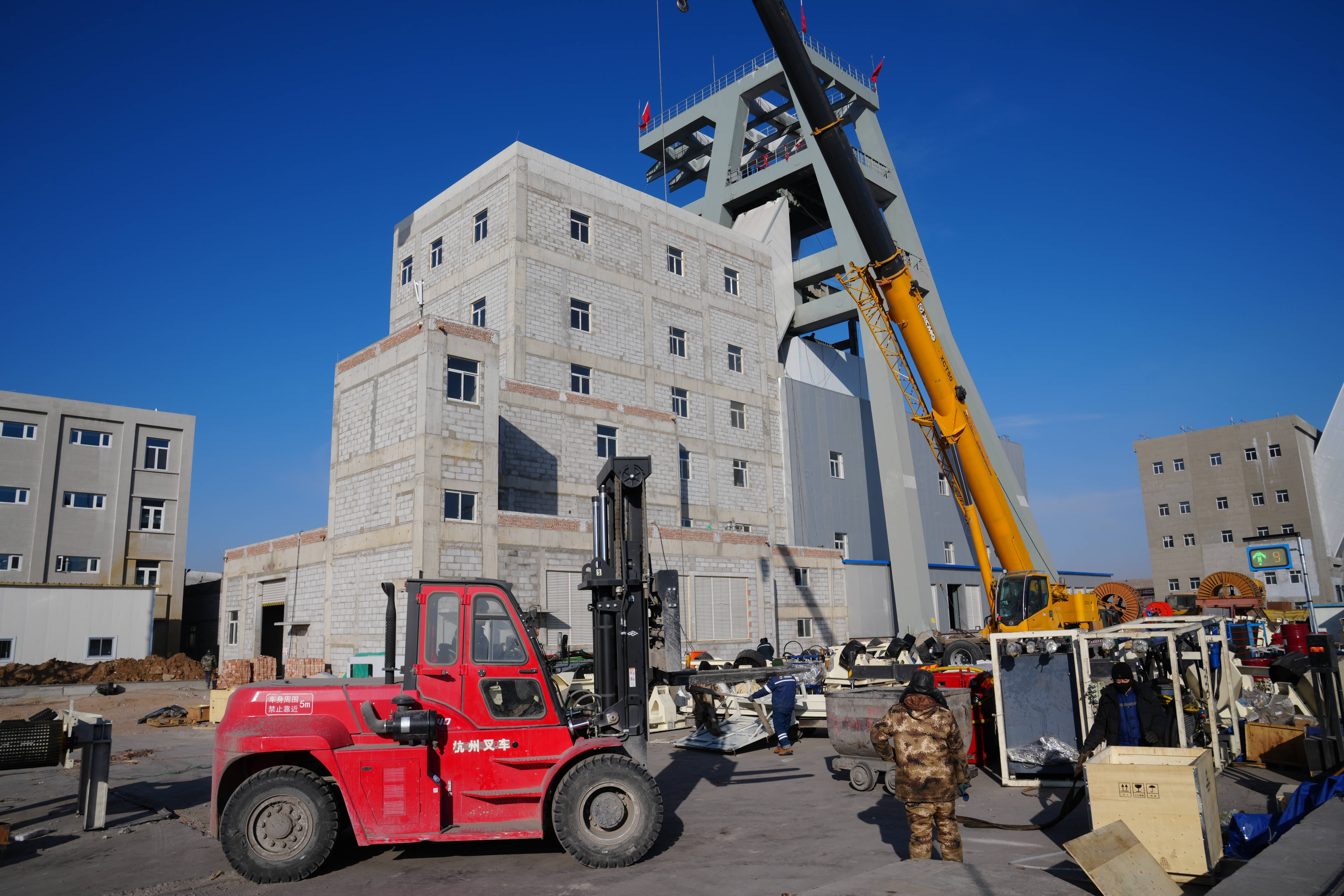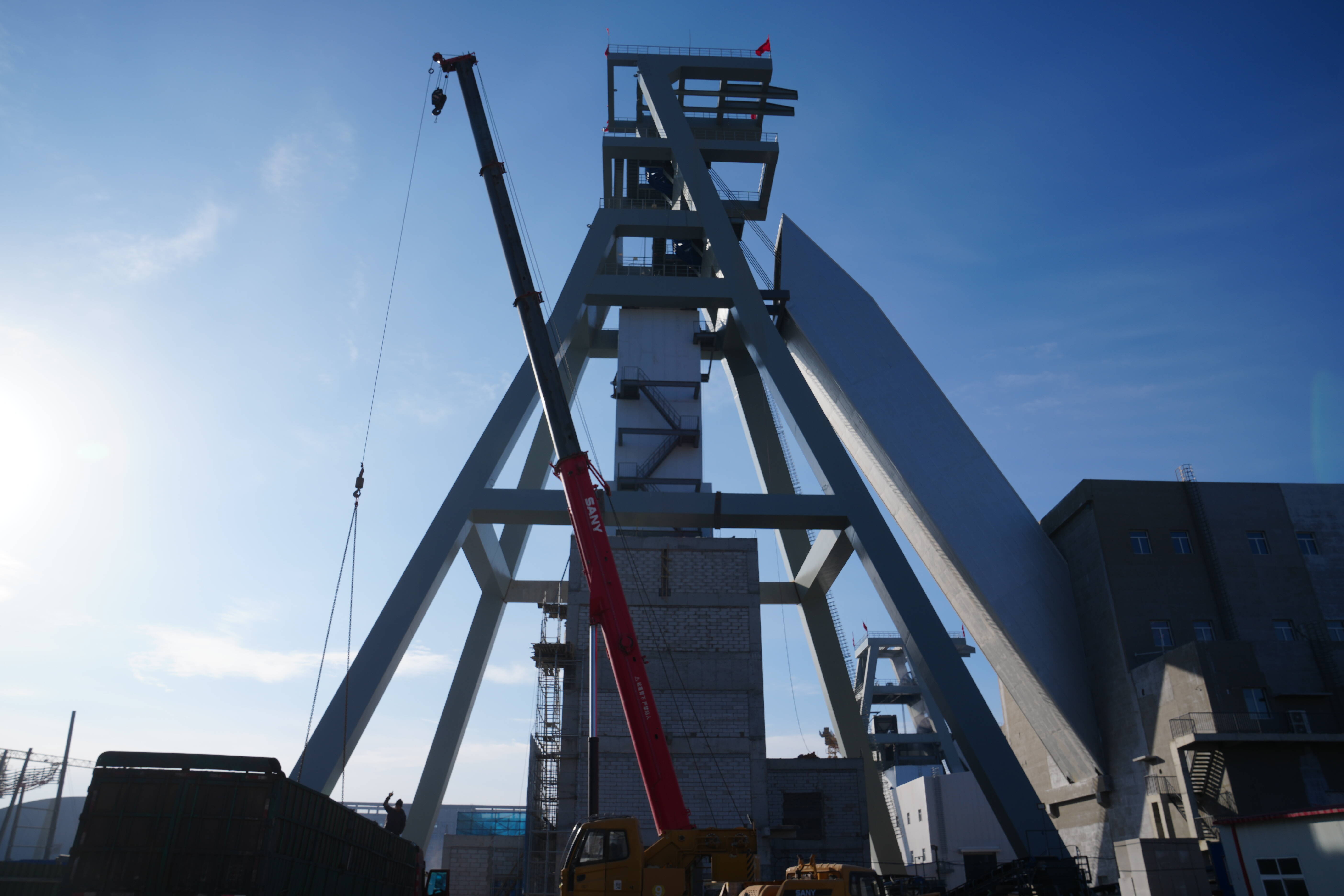 1月27日上午,油房壕煤矿地面主立井施工现场气温已然零下十几度,但现场施工人员工作热情一丝不减,机械设备运转的轰鸣声此起彼伏,大型吊车往来穿梭调运各种设备,一片繁忙景象。