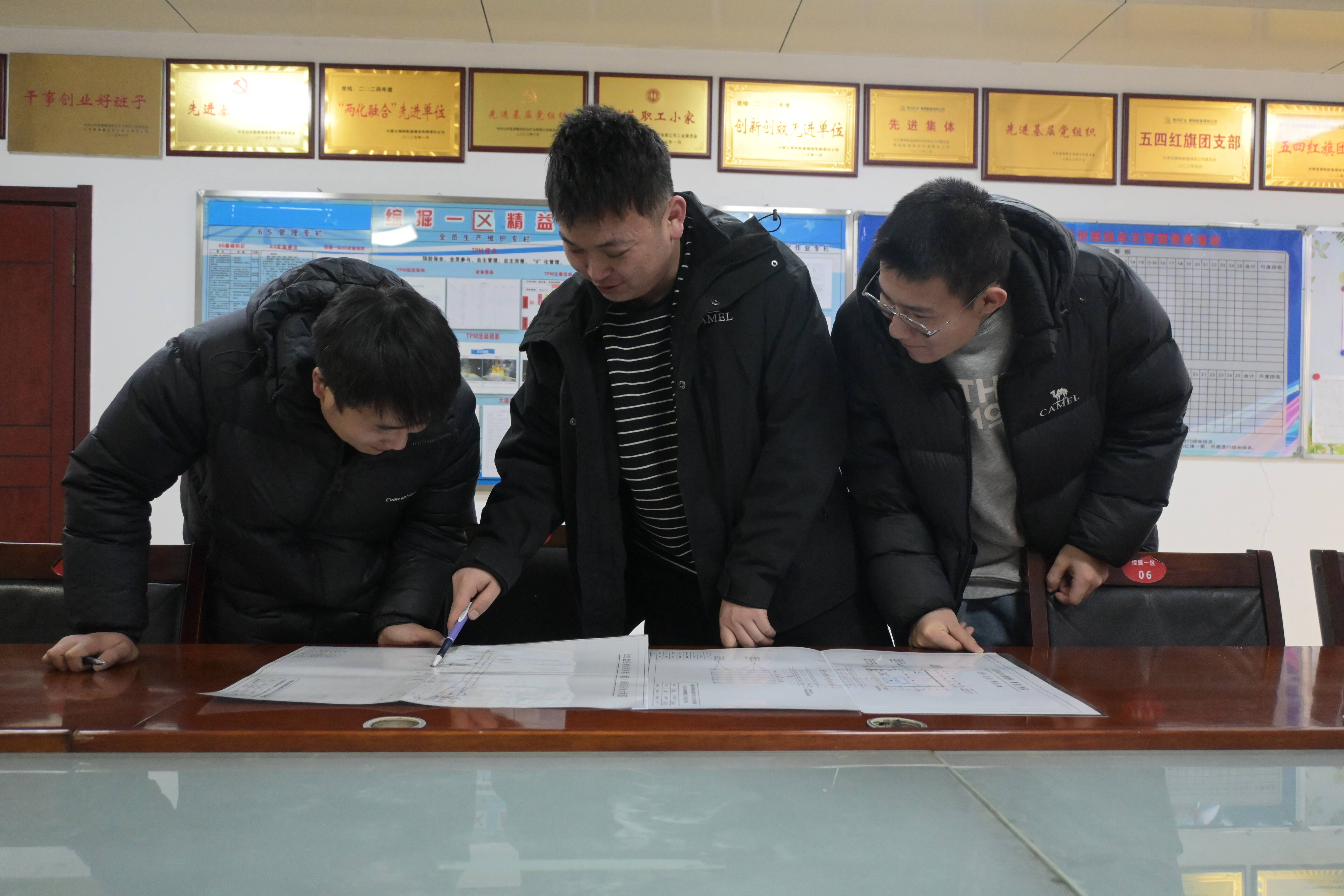 图为黄陶勒盖煤炭公司巴彦高勒煤矿综掘一区技术人员对生产工序优化情景