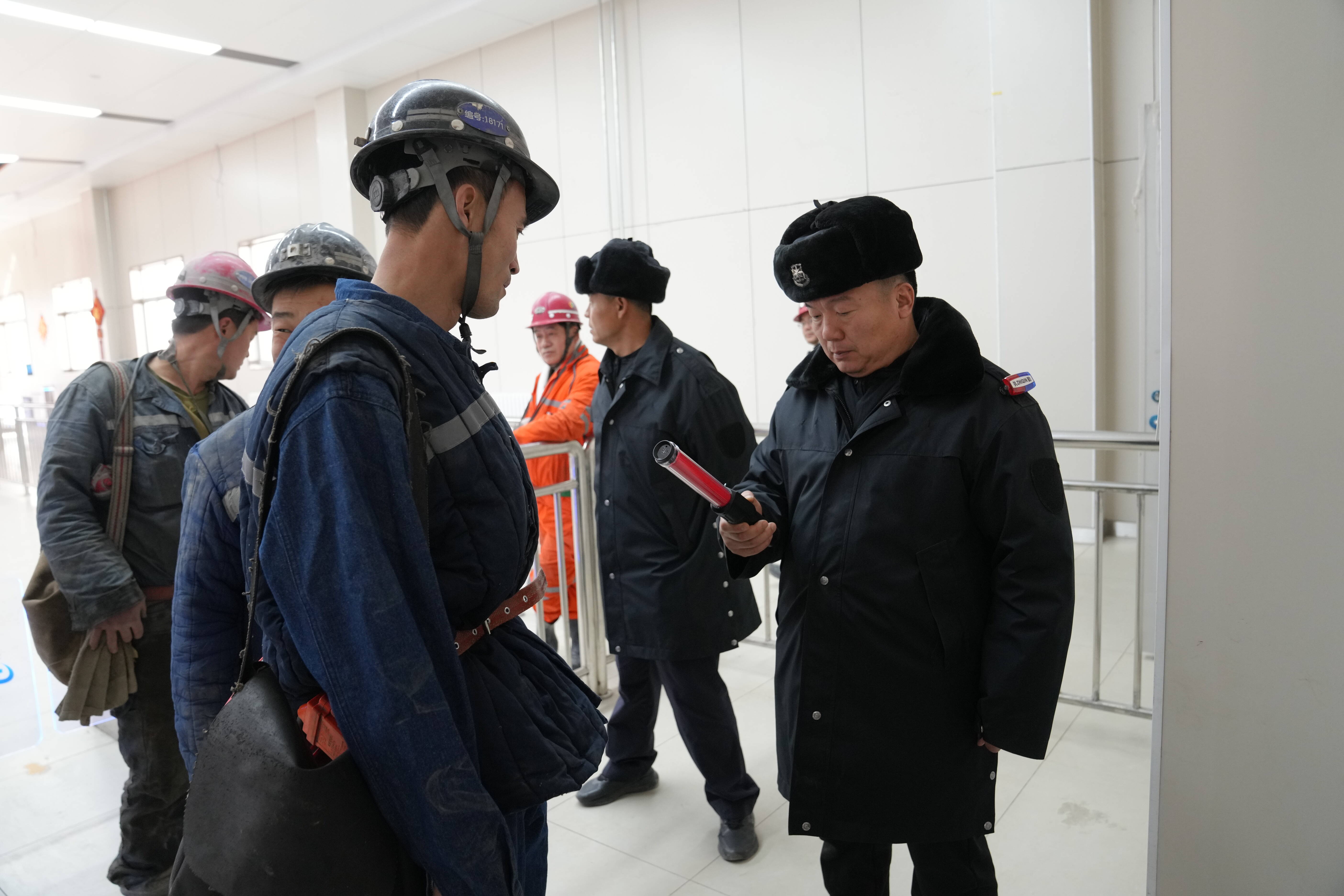 图为油房壕煤矿保卫人员在副立井井口对下井职工进行酒精检测