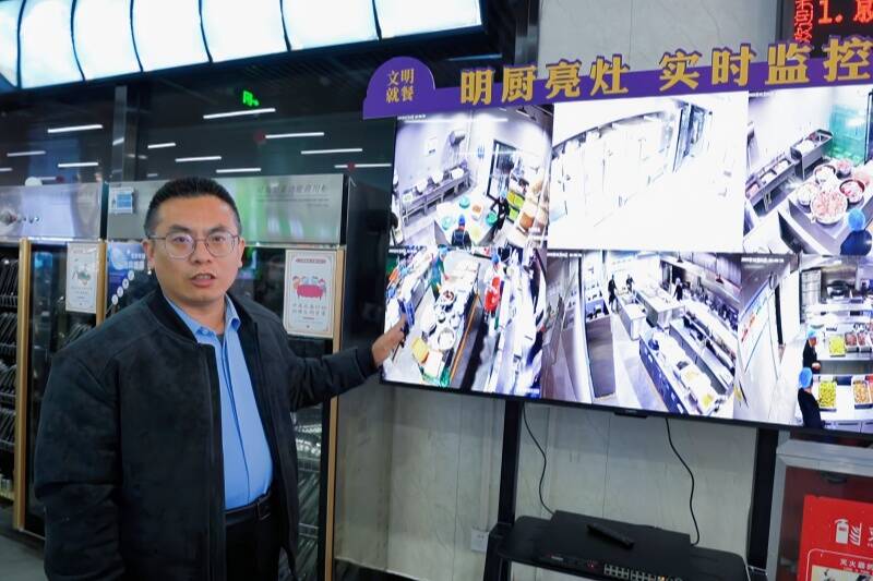 “通过电子显示屏,就能看到后厨所有操作细节,吃饭更放心,也更舒心了。”该公司综采一区职工雷文强在食堂一楼“明厨亮灶”后厨实时监控画面前驻足。