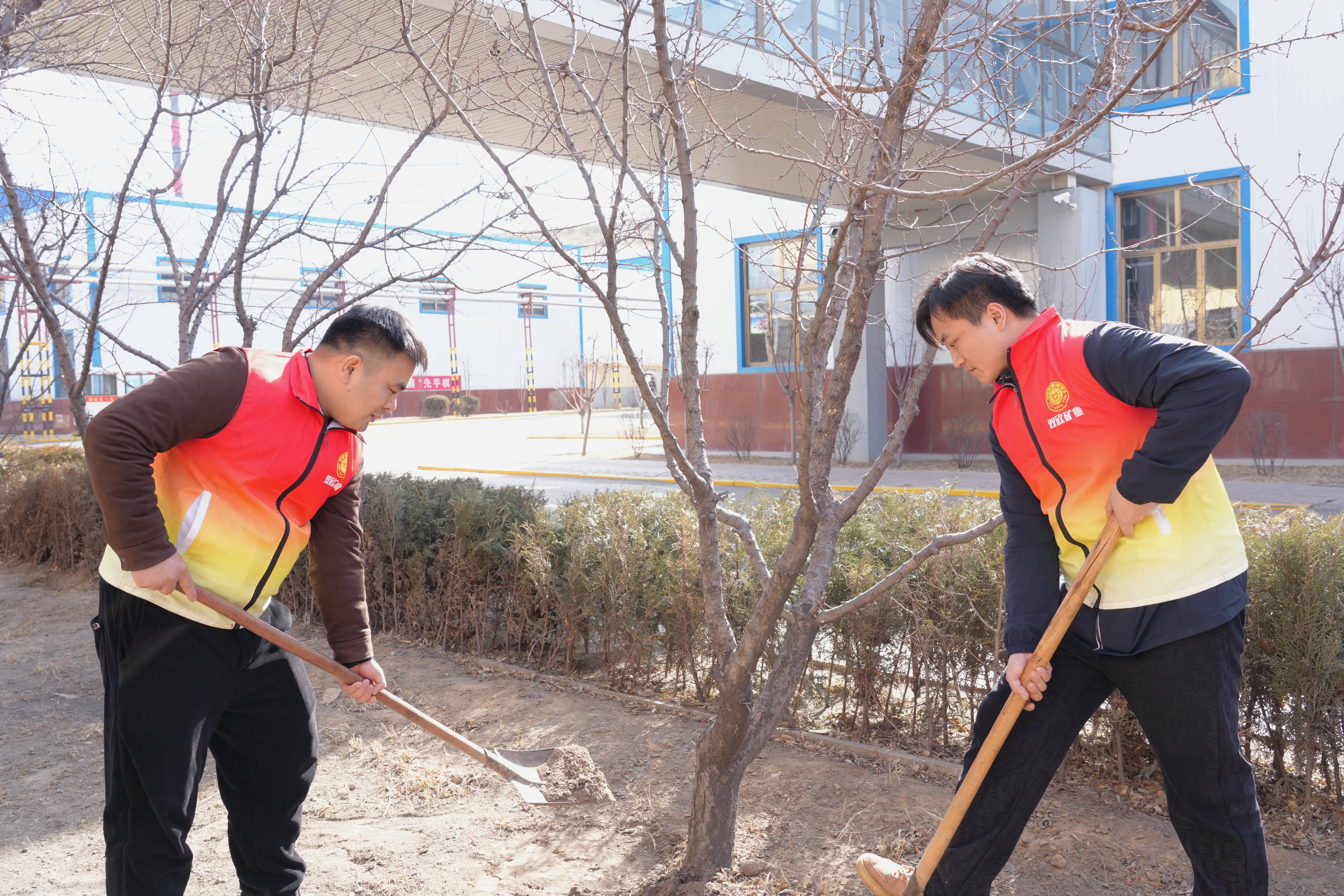 3月11日,在双欣矿业,一群身着红色马甲的志愿者正手持修剪工具,在专业工作人员的指导下精心打理着每一株绿植。