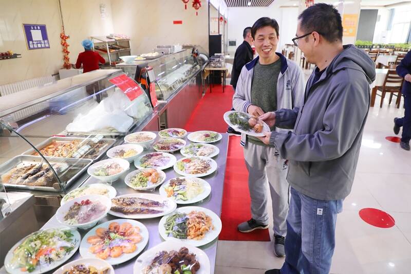 餐厅对餐具实行统一配备、集中消毒,职工从消毒柜中取出专属餐具有序就餐,既卫生又便捷。二楼特色餐厅适时推出时令菜品,“山蒜炒鸡蛋、炸鲜花椒芽、白蒿饼”等丰富多样的选择让职工吃得舒心。餐厅实行24小时供餐,无论是早班升井还是夜班出发,职工随时都能吃上热乎饭。