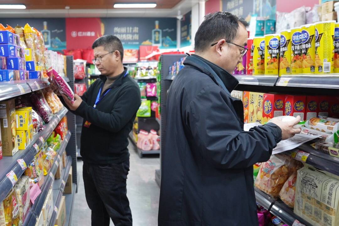 图为五举煤业职工代表对超市商品进行巡视检查
